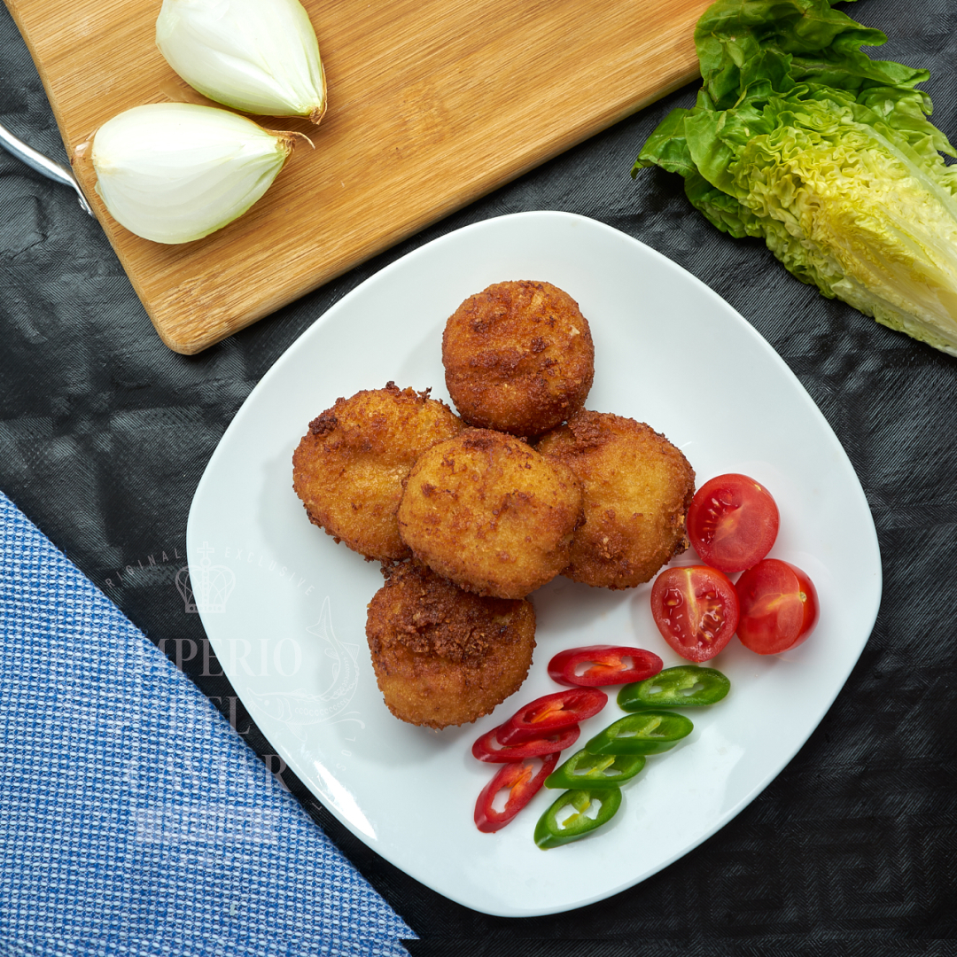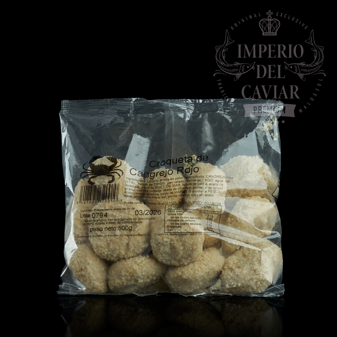 Leche entera en polvo hecha de cangrejos rojos 11%, harina de trigo, pan rallado (harina de trigo, agua, sal, levadura), corales de lubina, almidón, aceite de girasol, cebollas (cebollas, aceite de oliva, sal), ácido cítrico, gelatina, caldo de mariscos (contiene pescado), agua, almidón de maíz, sal, saborizante natural, ajo, pimienta. Puede contener trazas de soja, huevos y moluscos.