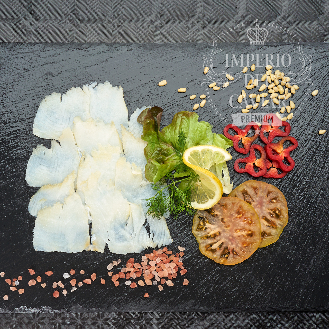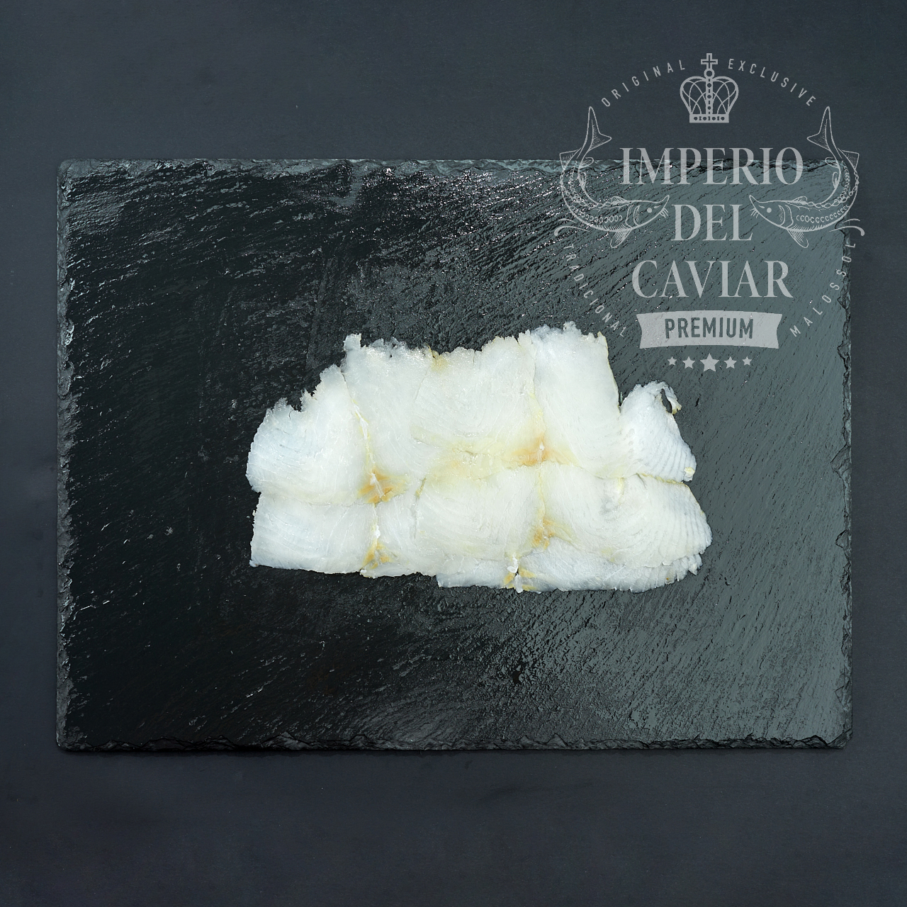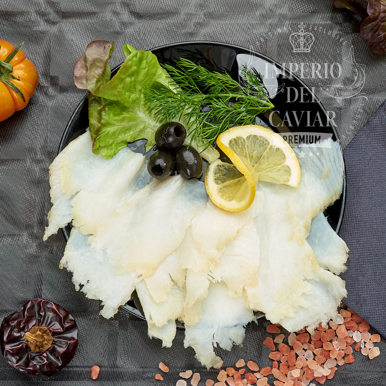 Muchos recuerdan el sabor del fletán desde la infancia: su carne tierna y fina debe derretirse en la boca. Un plato listo para servir o para preparar bocadillos con pepino. El fletán es un pez de la familia de los peces planos, que habita en los mares del norte. Su carne es muy tierna, suave y grasa, con muy pocas espinas. Durante el ahumado en frío, la temperatura no supera los 25°C y el proceso puede durar varios días. Como resultado, el pescado pierde el exceso de humedad, se seca y se vuelve más firme y menos graso. El valor calórico del fletán ahumado en frío es de 152 kcal por 100 gramos y, con este método de preparación, el pescado conserva su valor nutricional y sus propiedades beneficiosas. El pescado se prepara de forma natural, con astillas de aliso natural, sin ningún tipo de aditivos.