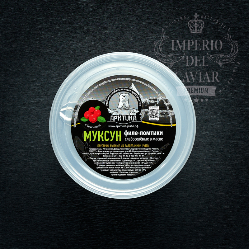 Filete de muksun (Coregonus muksun)(PESCADO), aceite de girasol 10%, arándano 5%, sal, conservadores (benzoato de sodio E-211, acetato de sodio E-262, sorbato de potasio E-202)