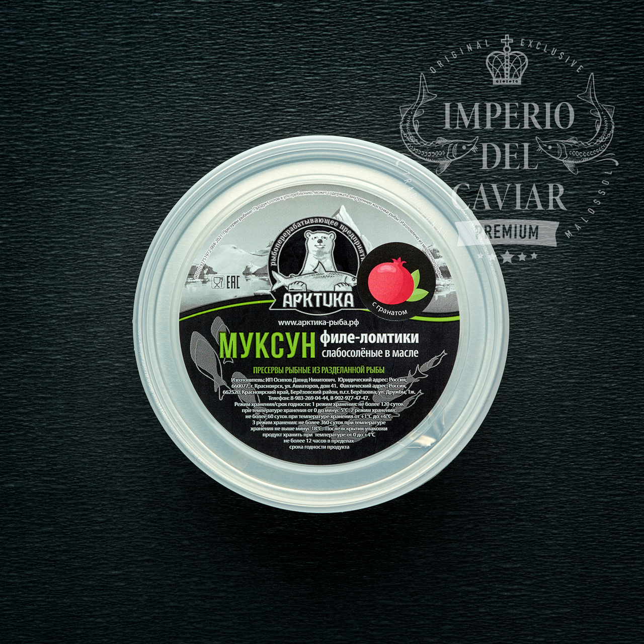 Filete de muksun (Coregonus muksun) (PESCADO), aceite de girasol 10%, granada 3%, sal, conservadores (benzoato de sodio E-211, acetato de sodio E-262, sorbato de potasio E-202)
