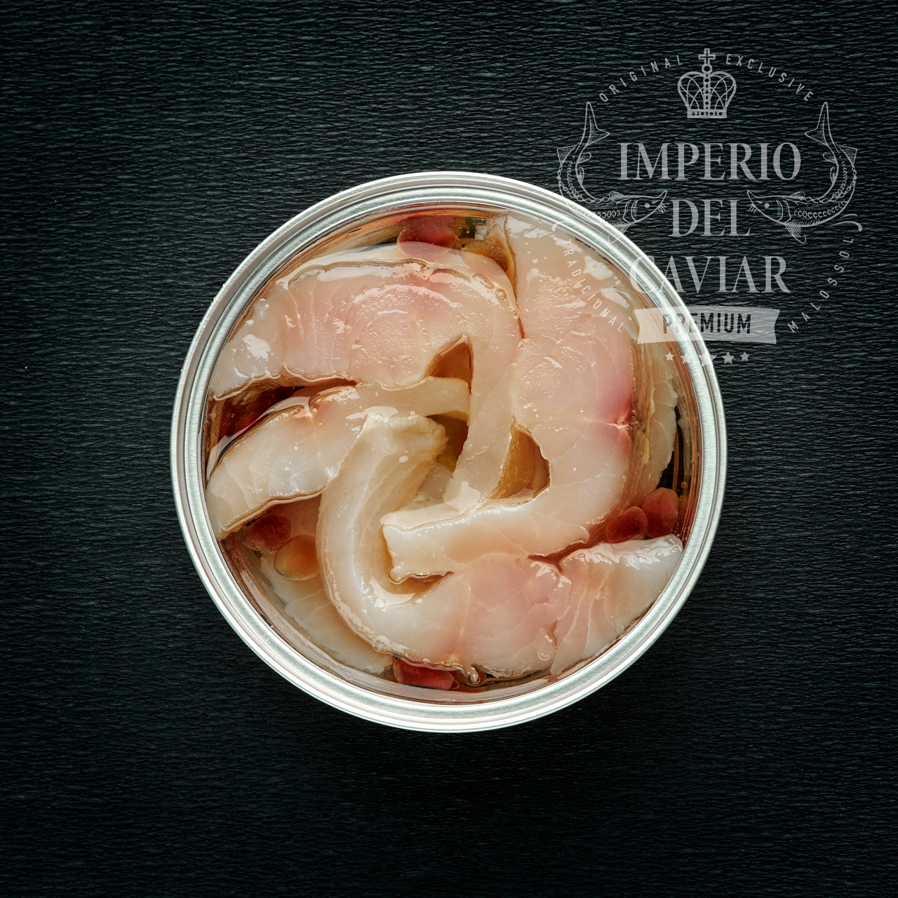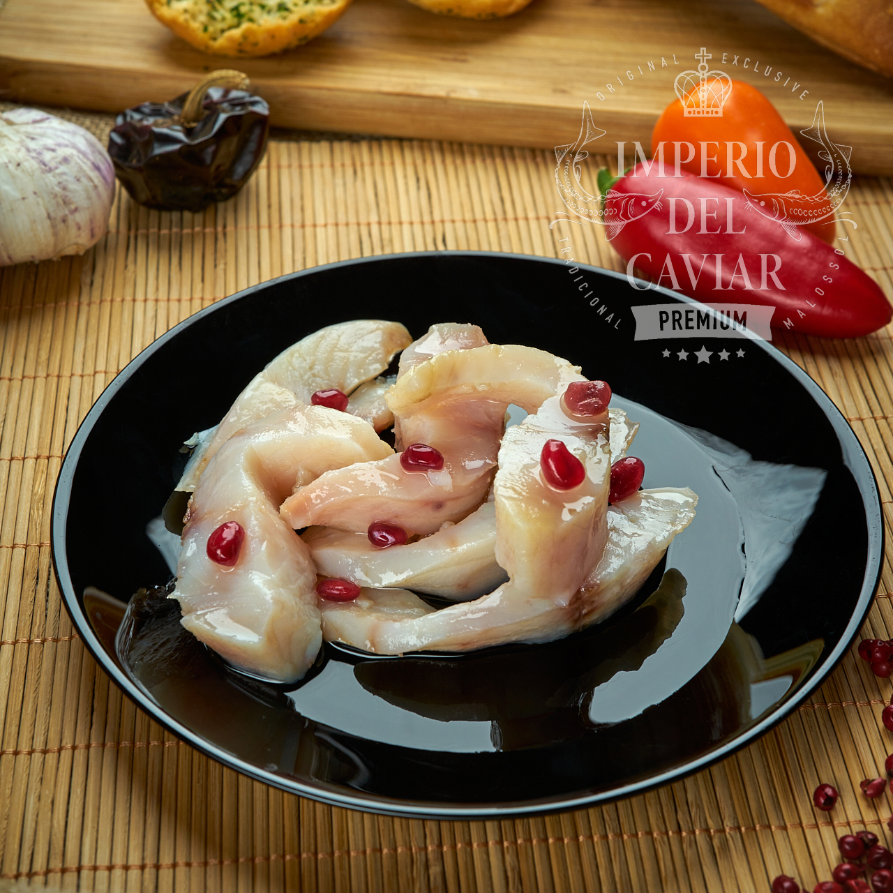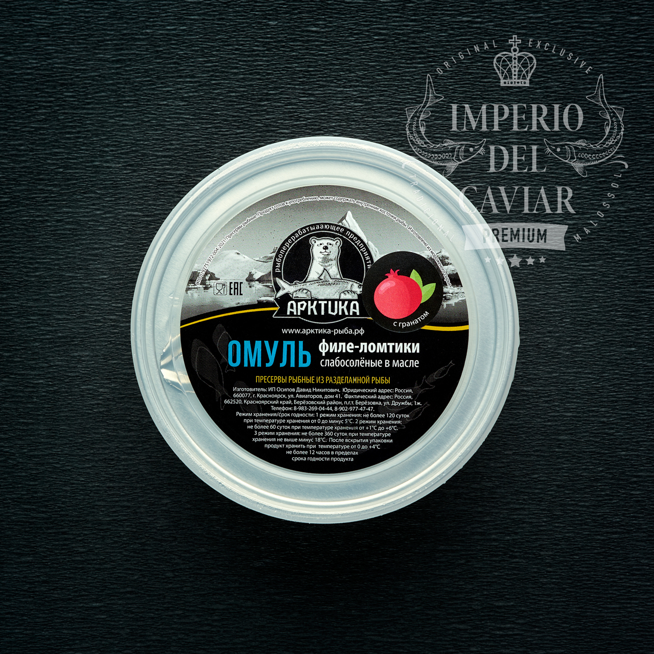 Es un plato listo para servir, con filetes cortados en hermosas rodajas de 1-2 cm de ancho, que se puede servir directamente en la mesa y no requiere procesamiento adicional. Los ingredientes son los más simples, como filetes de omul, un mínimo de sal, aceite y granos de granada. Los granos de granada combinan perfectamente con el filete de pescado. Aportan al plato un ligero toque ácido y un sabor especial. Omul es una especie de la familia de los salmones, pero su carne es de color blanco y no tiene un fuerte olor a pescado. El omul ártico se encuentra mayormente en el Océano Ártico y prefiere desovar en las frías aguas del norte de Asia o América. Este pez es bastante exigente y elige para reproducirse y habitar solo aguas limpias y ricas en oxígeno. Esta característica asegura que su carne esté libre de sustancias químicas nocivas y metales pesados. Su sabor recuerda un poco a la caballa (aunque no tiene nada en común con este tipo de pez). Peso neto 200g